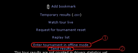 - オフラインでトーナメントの全走行が終了したら、Web ブラウザでトーナメントのページを開き、"Send results" (2) のリンクをクリックして、ダウンロードしていた tor ファイルをアップロードすれば、結果が反映されます。