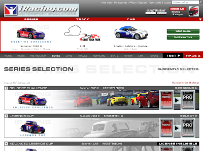 最初からインストールされているのはLegends Ford '34 CoupeとPontiac Solsticeですが、それぞれRookie及び非Rookieクラスに分かれていて、非ルーキークラスのクルマでテストドライブはできますが、レースに出るには資格が足りない(初期値2.50、インシデントで減ったりレース出場で上がったりする値が3.0ないとシリーズ参加権がない等)ので、実質的に最初に乗れるクルマはそれぞれのRookieクラス、となります。Rookieクラスのクルマは非Rookieクラスと比べて出力が控えめであり、各種セットアップ調整が行えません。