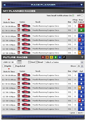 予定したレースが近くなると、Race Plannerの予定済レースセッションの一覧から、レース出走登録が行えるようです(青いボタンが緑になるみたい)。これはWhats Hotガジェットと同じ使い方みたいです。